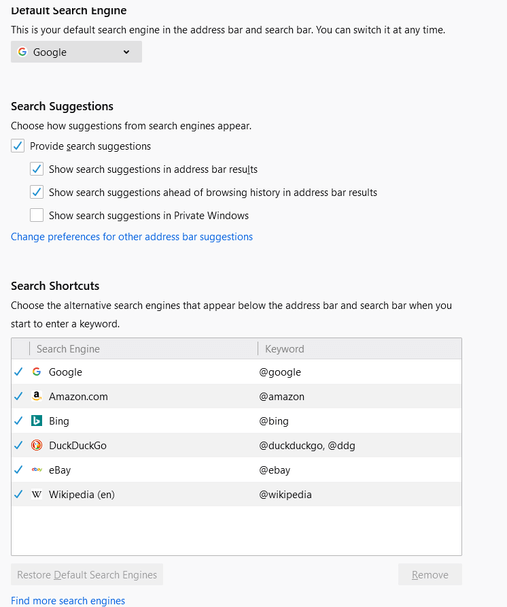 You'll want to be sure to choose a private search engine as your default. You can add them to Firefox by clicking the Find more search engines link near the bottom of the page.