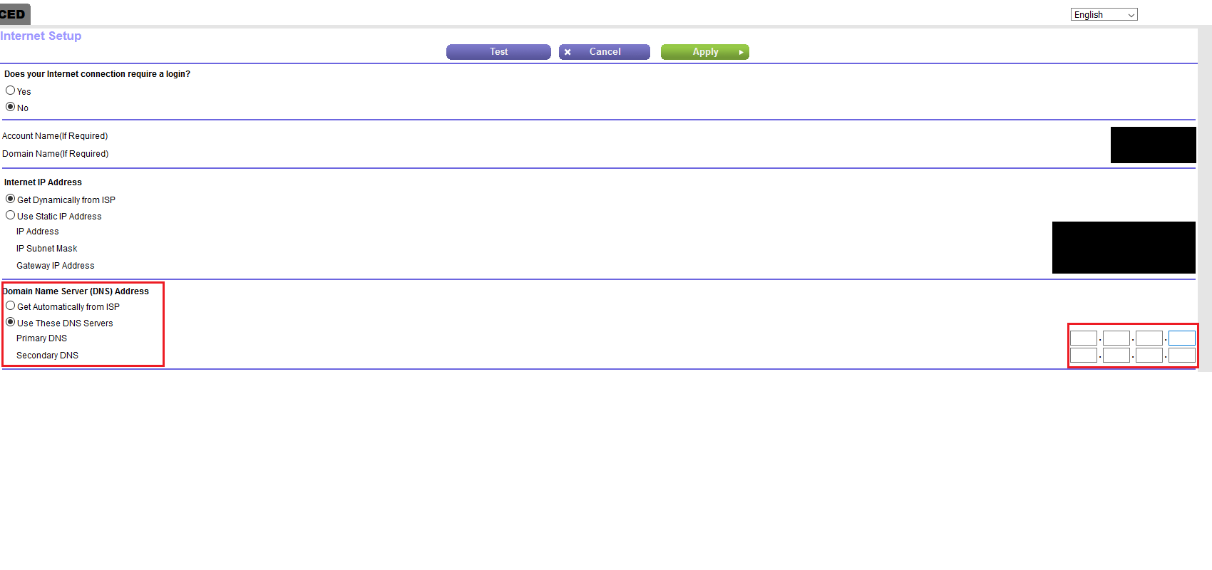 - Navigate to where the DNS settings are. This location varies among interfaces/firmware and may require extensive clicking or some manual reading on your part. Here's a screenshot from the admin interface of a NetGear Router for some reference:
