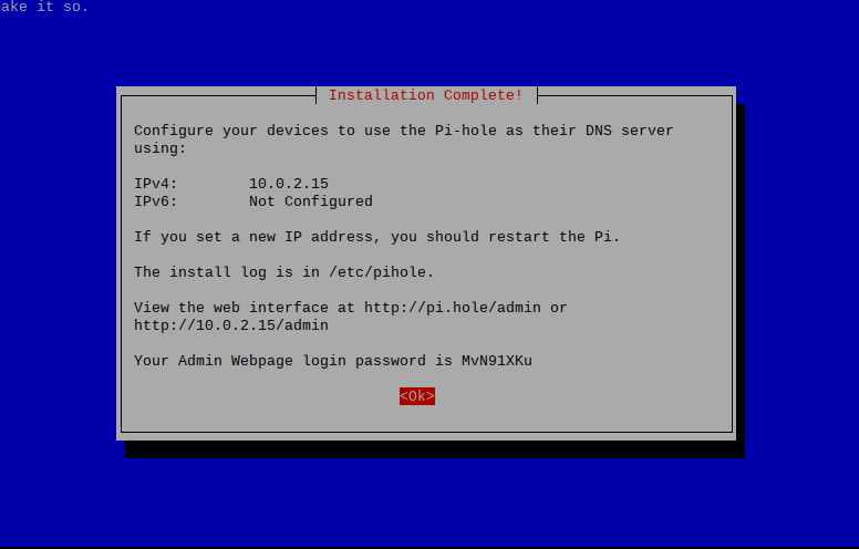 Once finished, you should get this final installer screen. Note that it has the default, randomized password for accessing the PiHole's admin interface: