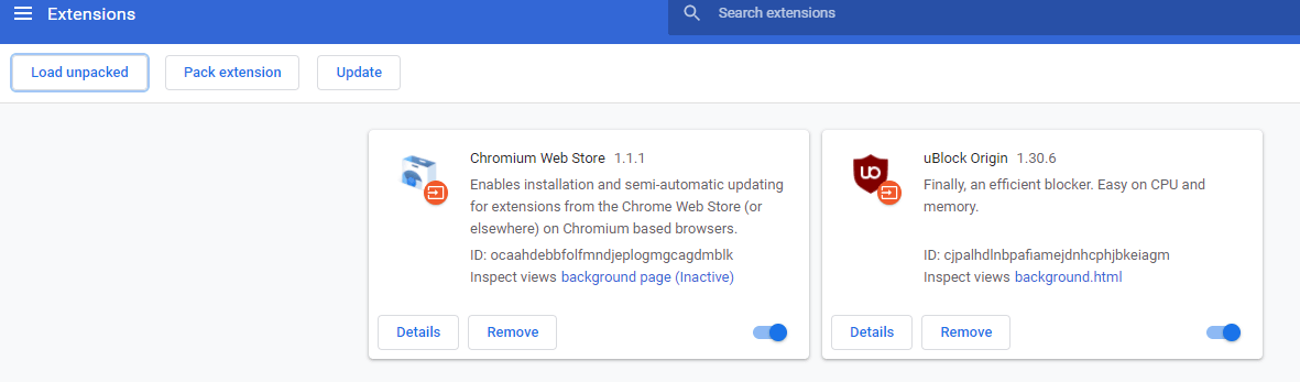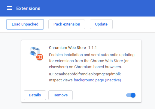 If you go back to chrome://extensions you should see your new extension, alongside the Chromium Web Store extension: