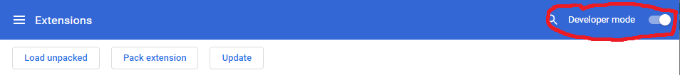 - In the top right, enable Developer mode (hint: it's enabled when you can see buttons for "Load unpacked" and "Pack extension.")
