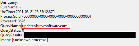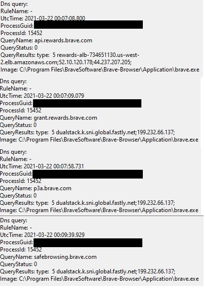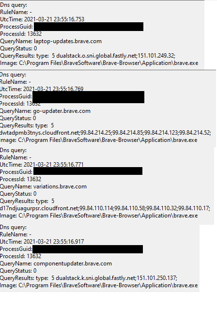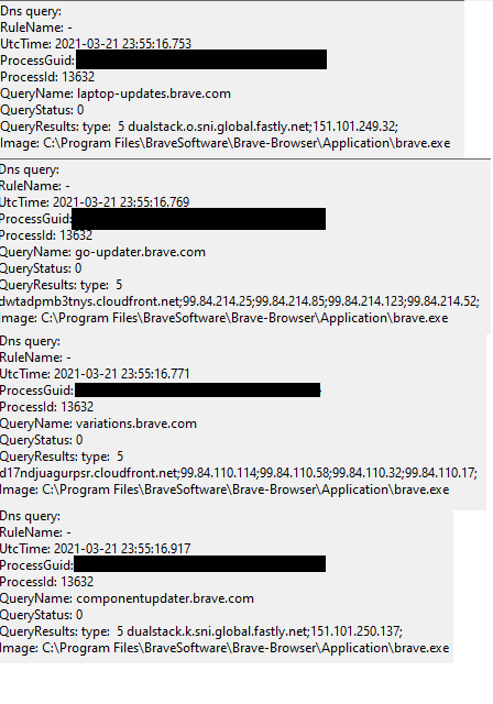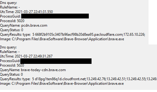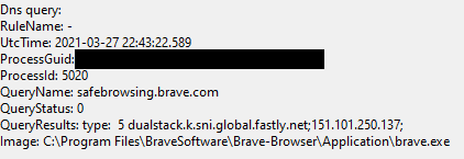 After the installer finished, Brave immediately launched. According to Sysmon, it made a number of DNS queries and connections right off the bat: