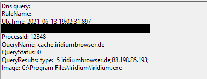 Once installation finishes, my Iridium install made a background DNS request to cache.iridiumbrowser.de.