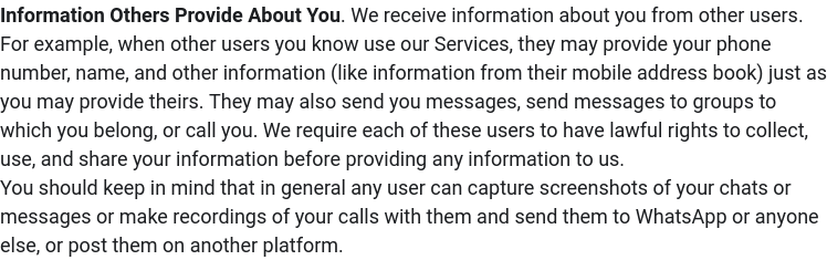 In addition to sending information to advertisers, WhatsApp also most likely receives data from advertising networks that exist outside of its own. While this isn’t explicitly stated, given Meta’s ad revenue and willingness to run ads that have pointed to known malicious domains, host/promote blatant misinformation, or point to scams.