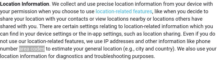 In its privacy policy, WhatsApp even explicitly states they use the area code of the phone number attached to a WhatsApp account to approximate user location: