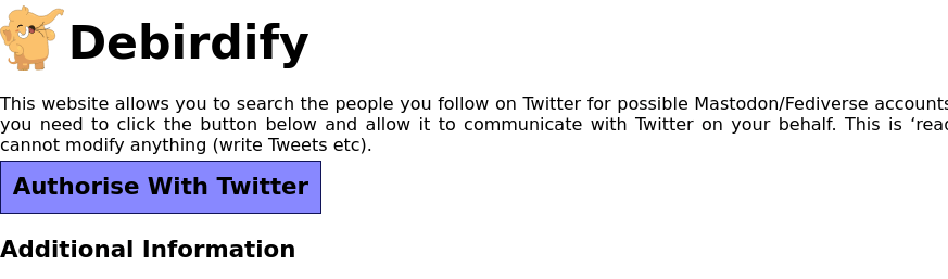Debirdify uses the Twitter API to search for people you follow on Twitter for possible Mastodon (and other Fediverse platforms) accounts. It uses various rules, typically associated with fediverse accounts (like @user@host.tld) to find any possible fediverse account matches.