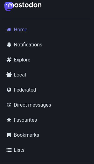 Three timelines (or “feeds”) exist in Mastodon: Home, Local, and Federated. Home is a feed for the accounts you follow, local shows activity from the server instance, and federated shows activity from servers the instance communicates with.