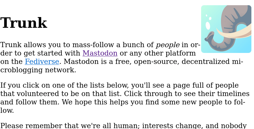 Trunk is another human-curated list covering a wider range of topics. Accounts listed here are personal accounts - in the context of they’re not organizational accounts. Accounts listed here are also active on Mastodon, minimizing any crossposting from Twitter.